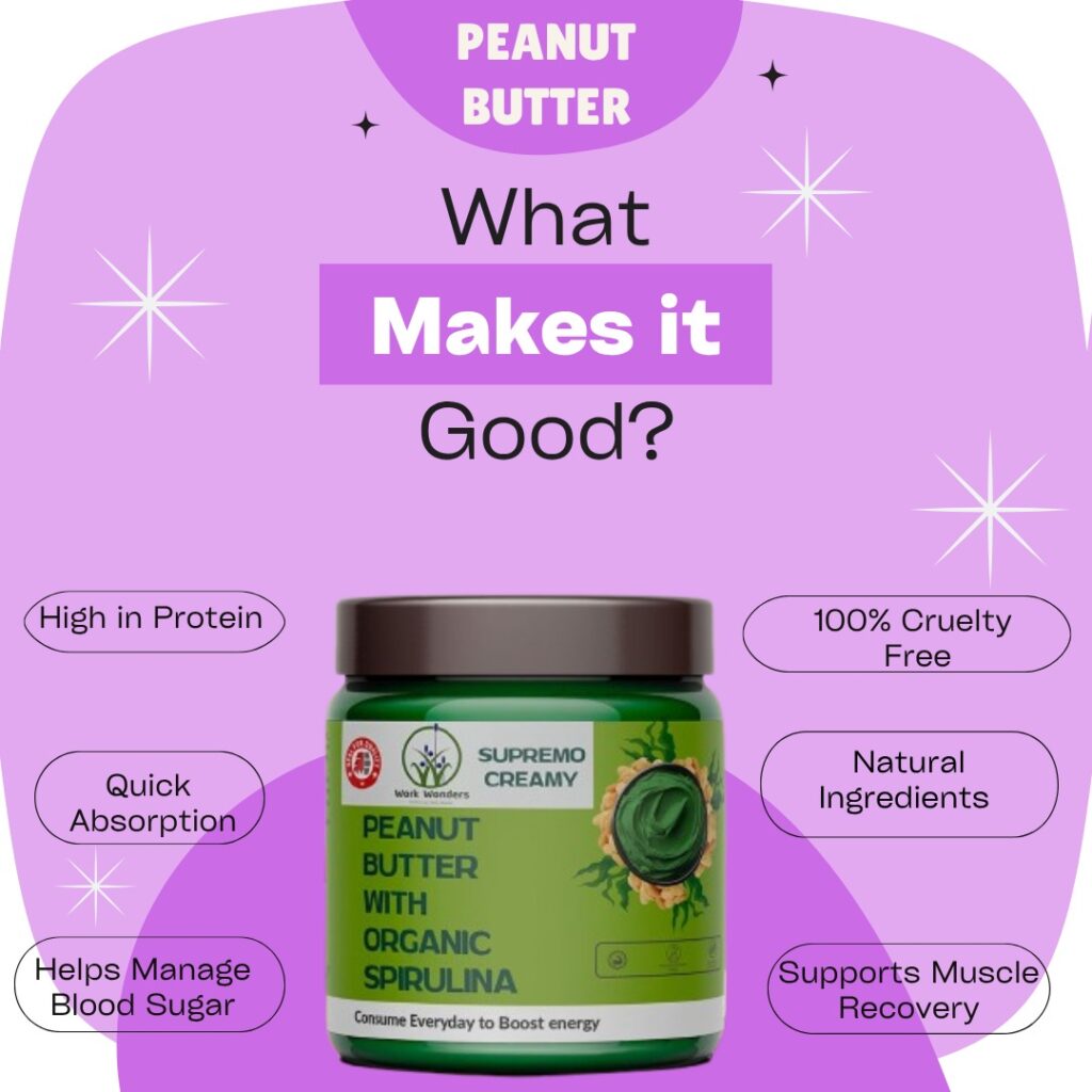 Work Wonders Peanut Butter with Spirulina is made from peanuts, spirulina, sucrose, and a small amount of natural emulsifier, offering a smooth texture with a naturally sweet taste and added nutritional value.